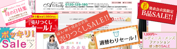 現時点では「アビバーレ」のSALE、商品数、サイトの充実度は「楽天店」と「YAHOO」店が良いようです。 激安SALEやお得キャンペーンが開催されているのもこの2つのショップです。